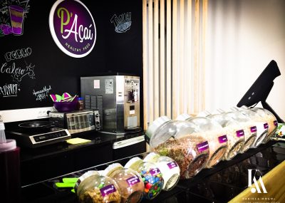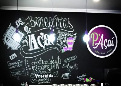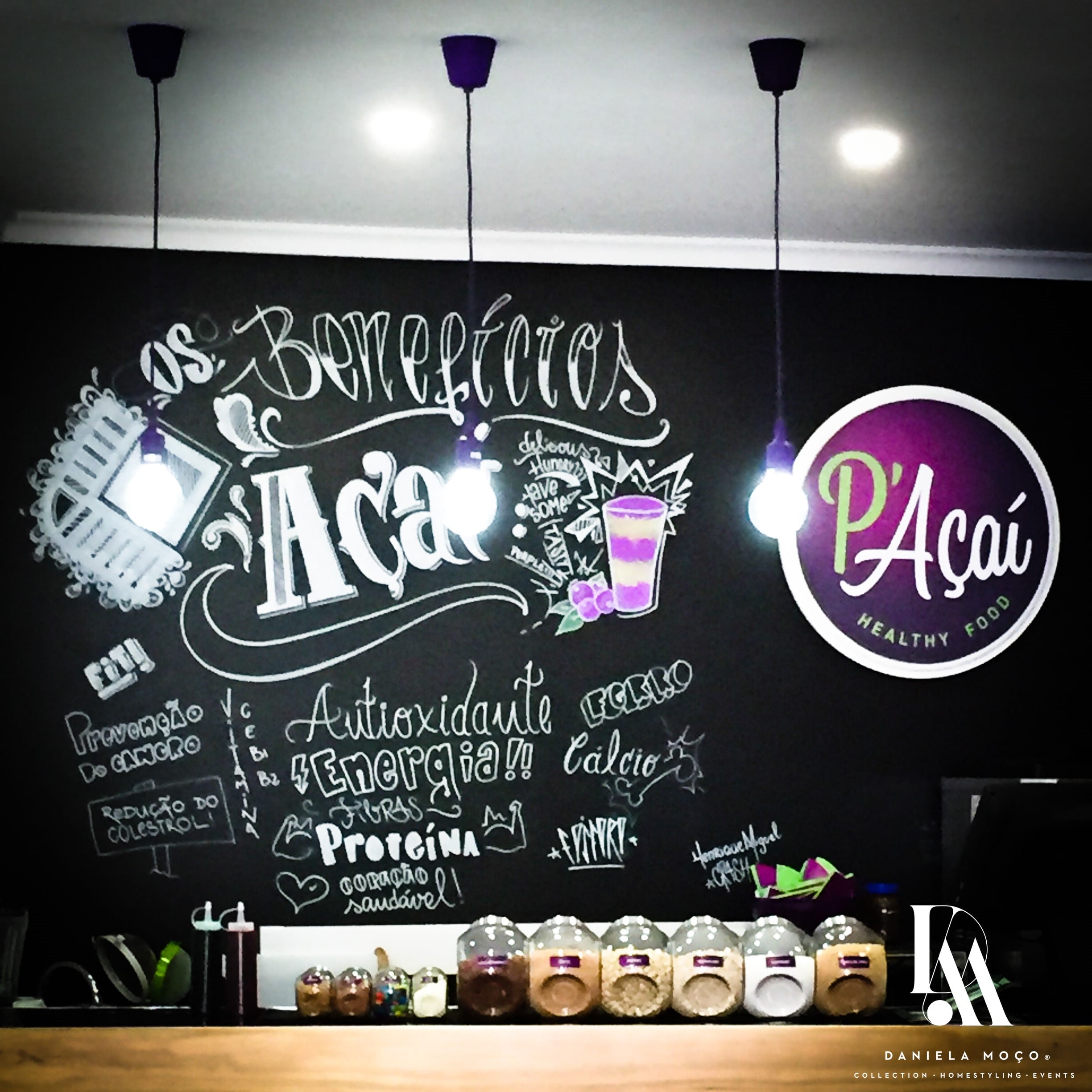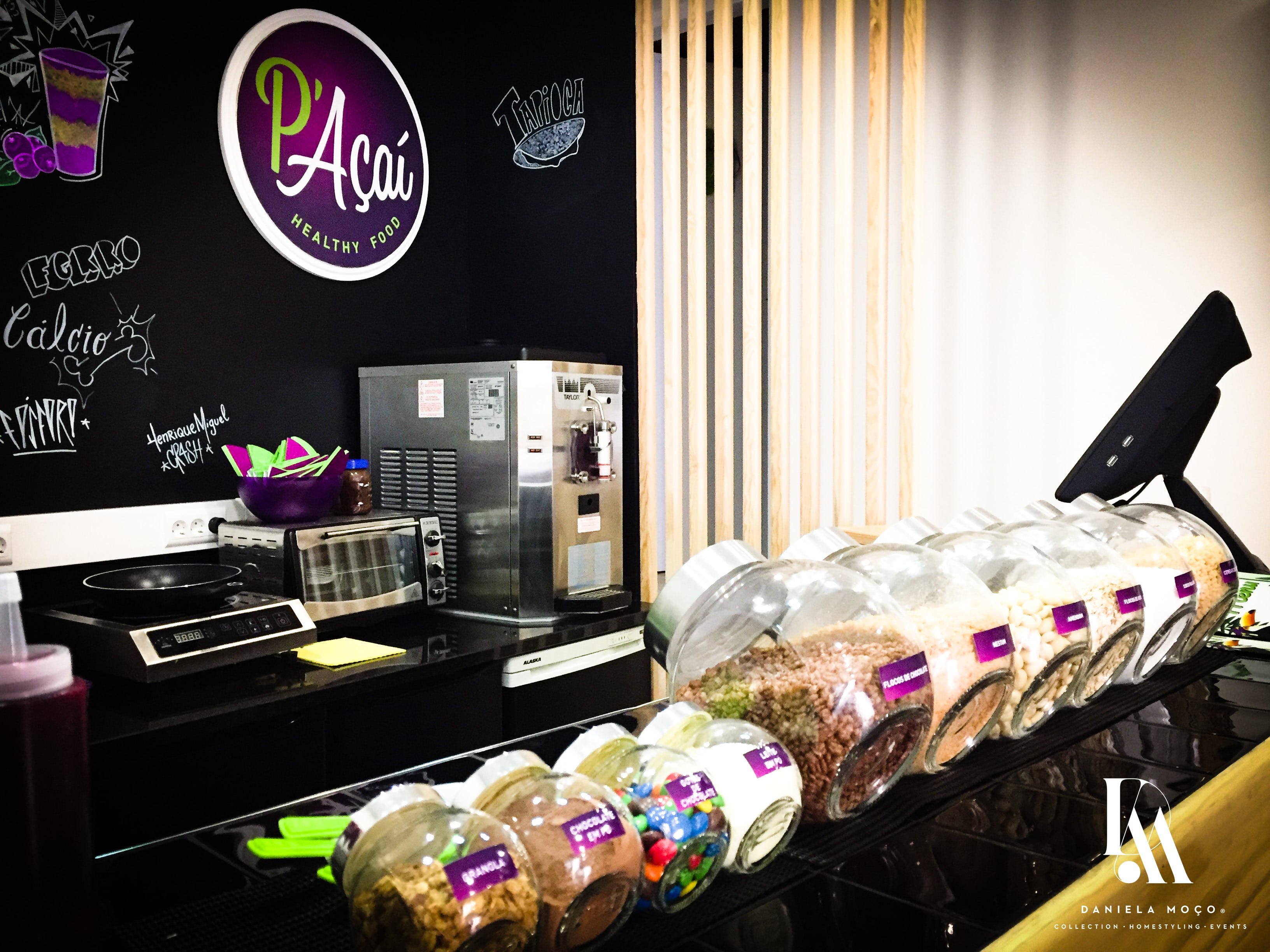 Em função do tema da loja e respetiva área de negócio, a minha proposta incidiu no contraste de cores: o fundo preto (em tinta ardósia), as madeiras do balcão e mesas em tom claro; coxins em padrão vivo que articulassem com todo o estacionário e material publicitário. Destaque para a proposta de uma parede pintada à mão, que aludisse a articulação entre Brasil e Portugal, em concreto Coimbra. Também a questão da iluminação foi uma prioridade.
