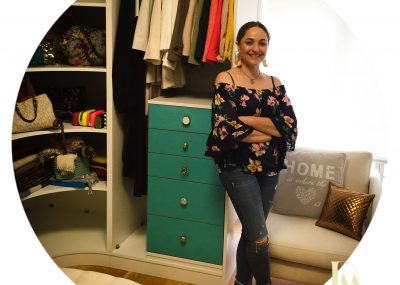 A configuração de carpintaria é simétrica, ou seja, cada uma das duas pessoas tem a mesma possibilidade de arrumação. Destaco a otimização dos cantos, através de uma solução angular que rentabiliza 100% esse espaço. Quanto a cores, optei pelo tom de carpintaria claro. O destaque surge de um trabalho manual, estilo vintage, efetuado nas gavetas e aros da sapateira, num lindo tom de azul esverdeado, com apontamentos de dourado no desgaste efetuado. De resto, os restantes apontamentos dourados que se encontram conferem o glamour pretendido.