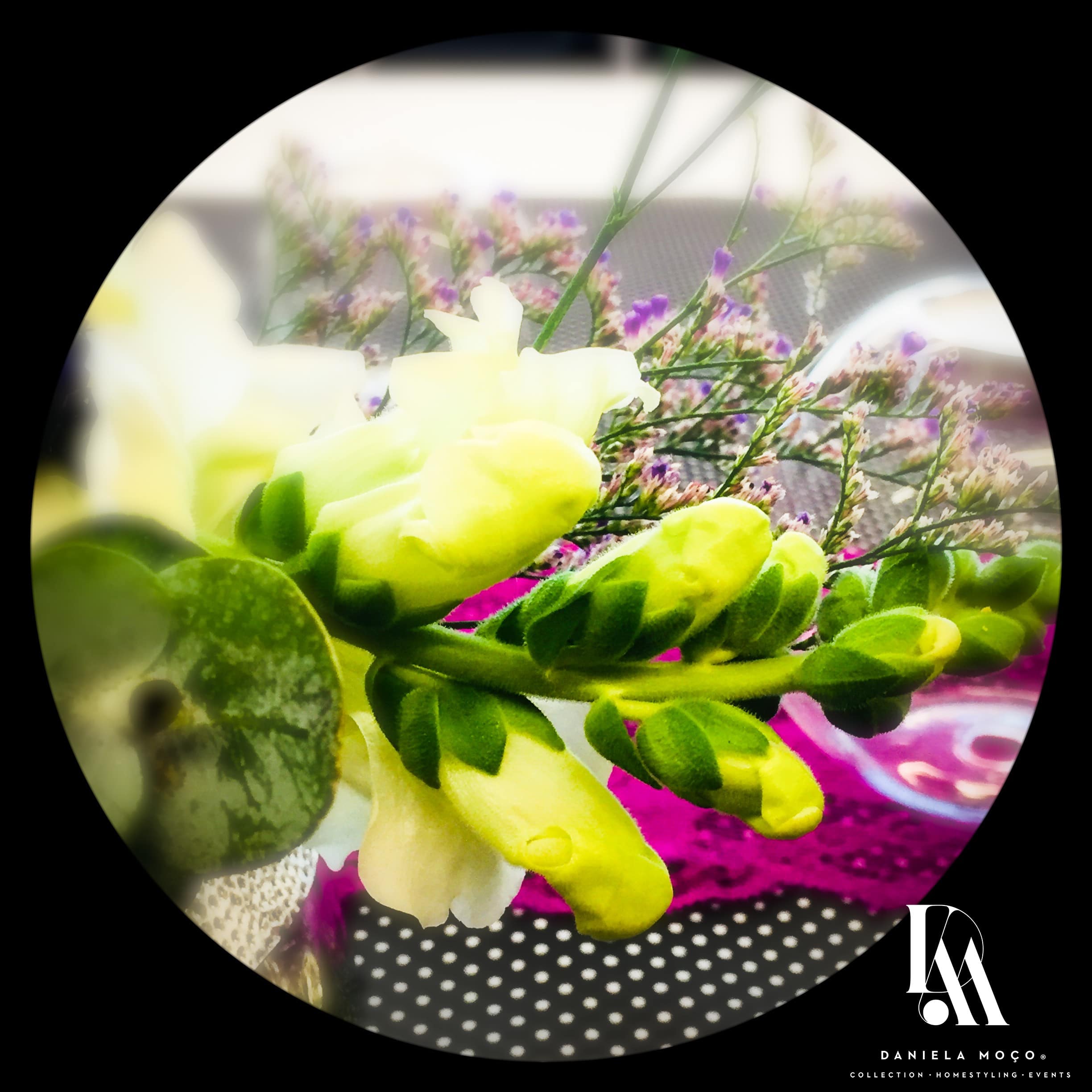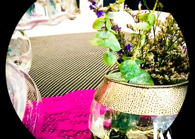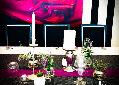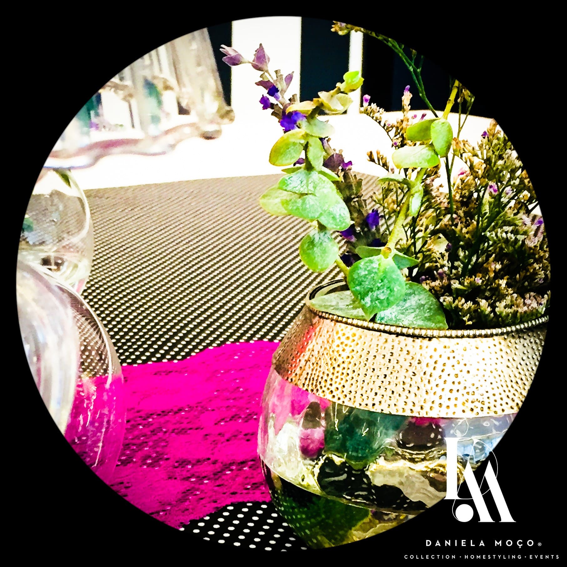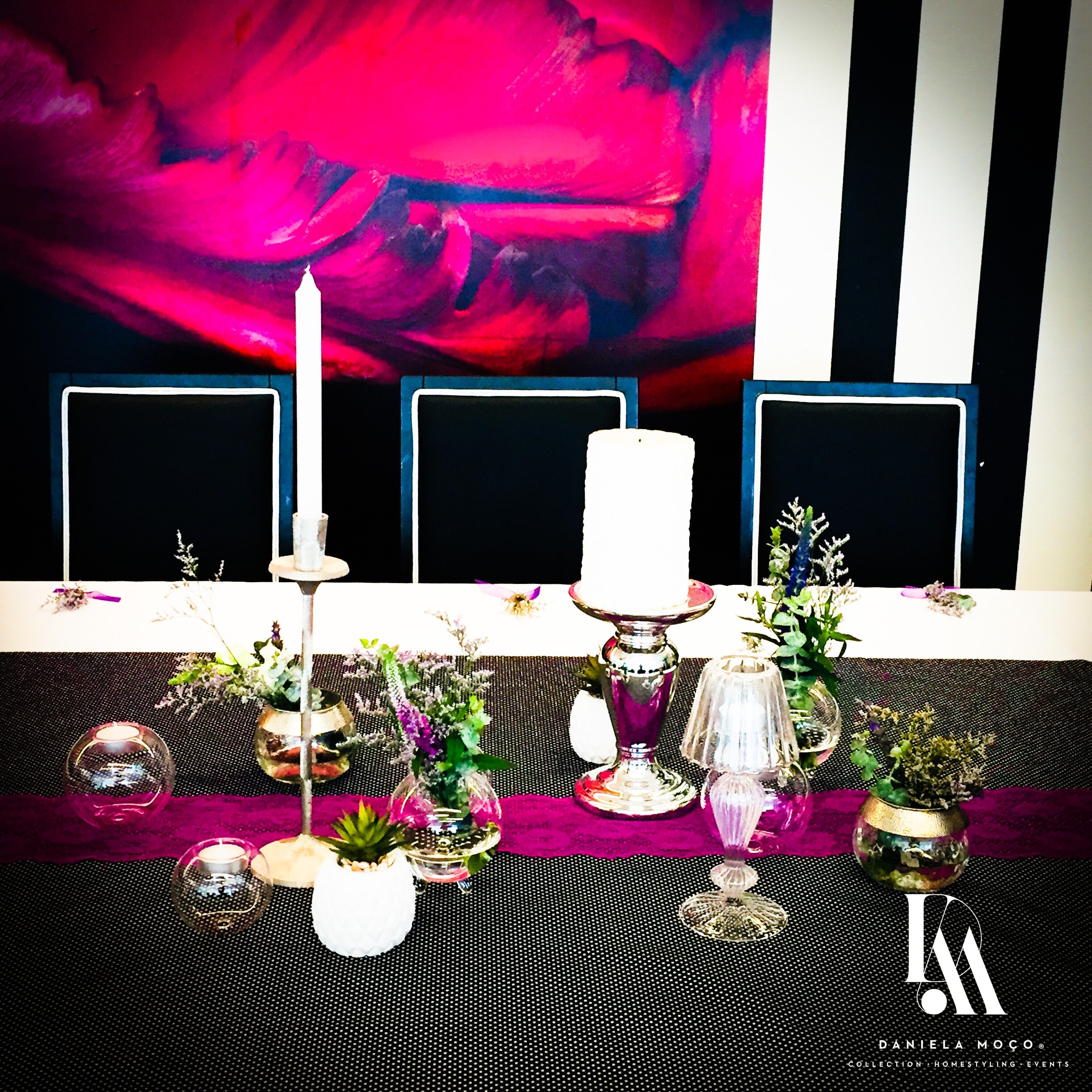 Ao utilizar um tecido preto com bolinhas pretendi uma certa jovialidade, que conjuguei com renda lilás, procurando o glamour solicitado. Privilegiei as peças de vidro, em diferentes formatos, assim como, usei e abusei de diferentes castiçais. O resultado ficou bastante delicado.