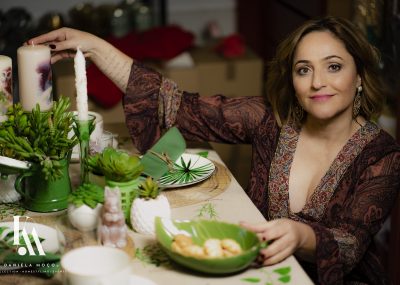 Nesta mesa, proponho um ambiente quente, de verão, em tons verde, onde predominam as suculentas e o padrão “catos”, visível nas diferentes peças de louça.